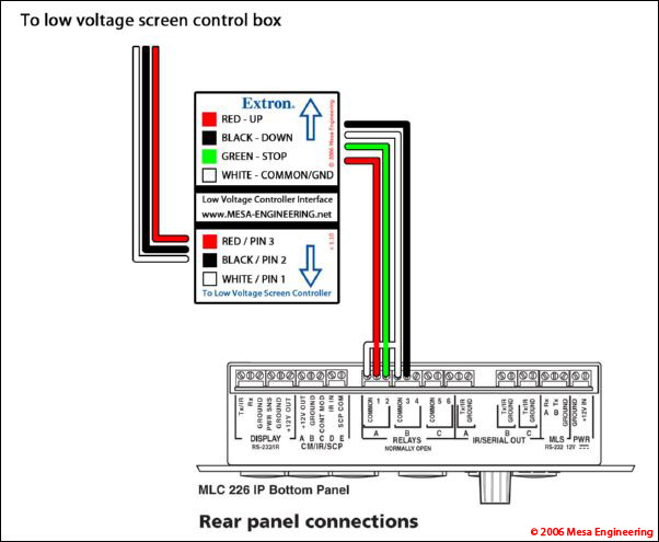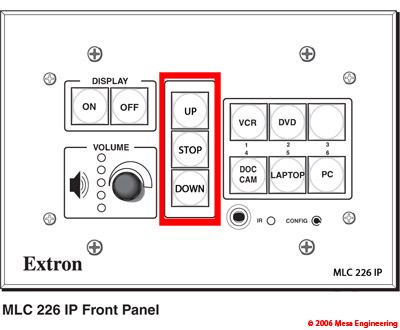 Extron MediaLink series panels only have relays for control interfacing. These interface ports do not have the electrical capability to control the screens simple up, down and stop commands by themselves. It takes a complex system of diodes and electronic parts to be connected to the Extron MediaLink panel for the functions to work. Extron does not supply any parts or schematics with the MediaLink panels nor do they have any product to complete this function.